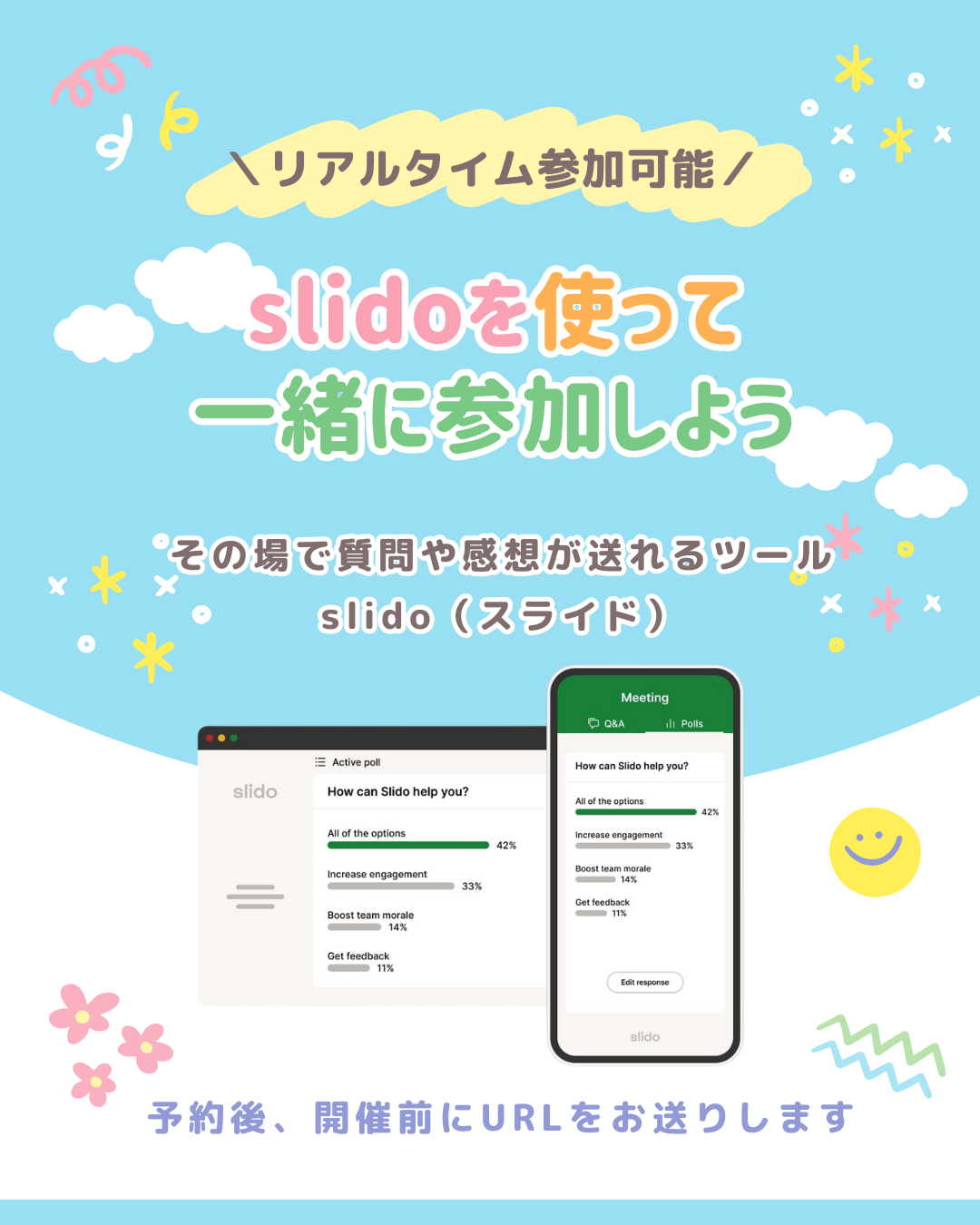 また、リアルタイム質問ツール「Slido」を導入し、当日その場で質問や感想を投稿いただけます。